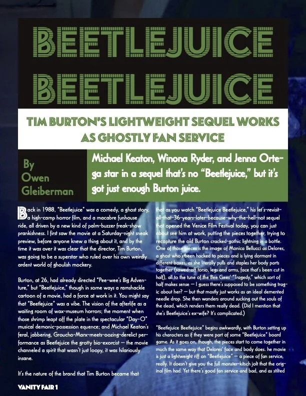 For this assignment we were told to do an entertainment magazine spread design. We were given the choice between either Beetlejuice Beetlejuice or Alien: Romulus - I chose Beetlejuice Beetlejuice. We were given the copy and titles and were tasked with the design. This was created on Adobe InDesign and some edits in Photoshop.
